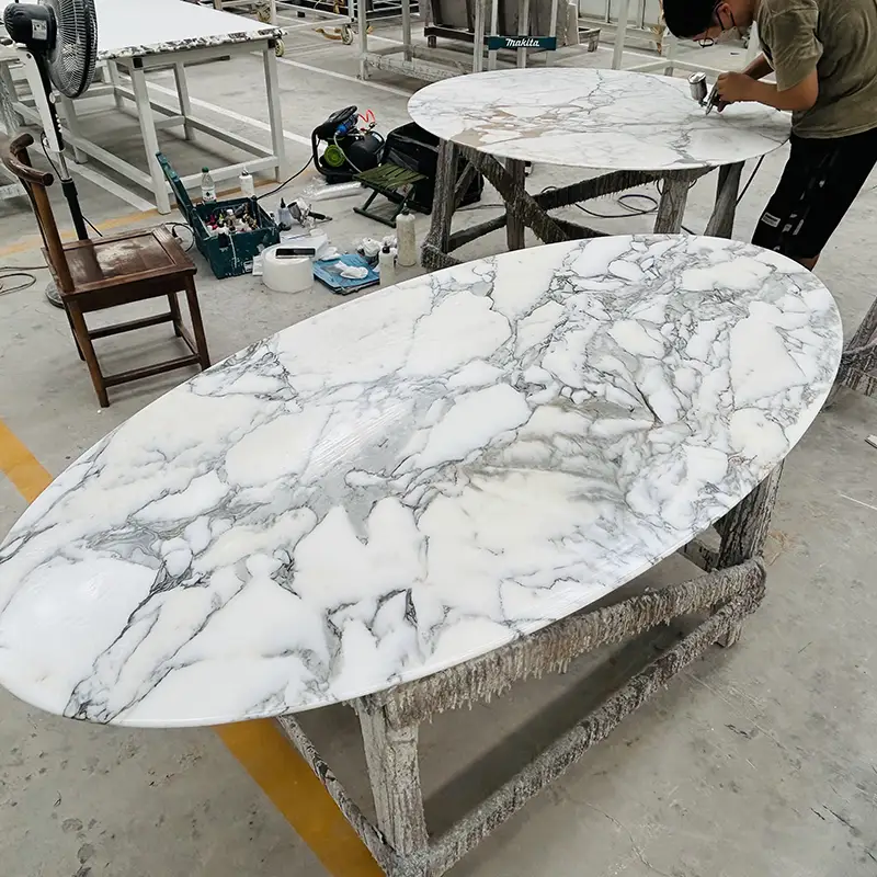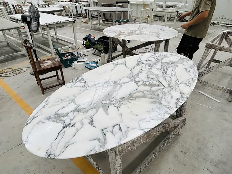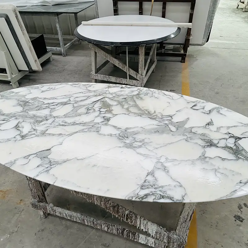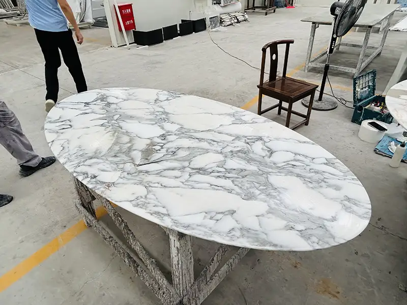 Bevor wir mit der Produktion beginnen, bieten wir sogar gründliche Renderings und Voransichten, sodass Sie genau sehen können, wie sich Ihr Arabescato -Marmor -Tischtisch herausstellt.