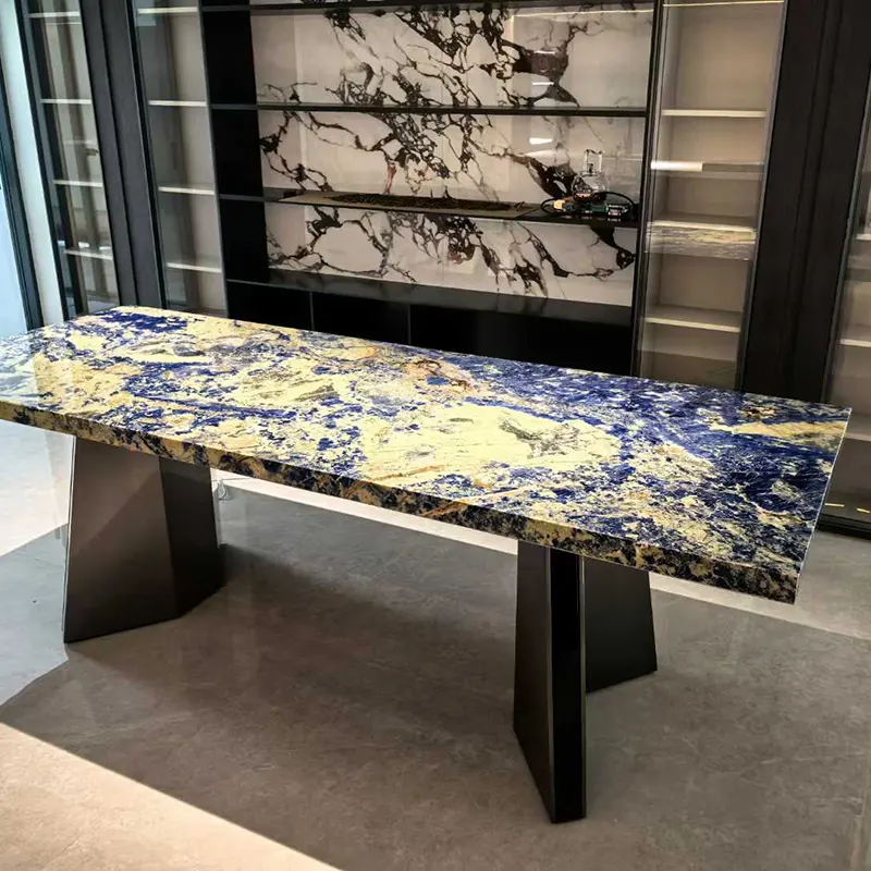 Bolivienblauer Granit wird von Menschen auf der ganzen Welt auf verschiedene Arten genutzt. Besonders für Gegenstände wie eine blaue Granitkücheninsel wählen die Menschen häufig größere Platten in den USA und in Europa. Sie bevorzugen einfache, lange Designs, die vielleicht mehr als 2,4 Meter lang sind. Kleinere sind angemessener, da die Häuser in einigen asiatischen Ländern in der Dimension etwas kleiner sind. Der Esstisch ist in der Regel 1,2 bis 1,5 Meter lang und hätte abgerundete Kanten so, dass er warm zu sein scheint. Die Wandfliesen sind 300 x 600 mm oder 600 x 1200 mm groß, während die Bodenfliesen 600 x 600 mm oder 800 x 800 mm groß sind. Glänzend, matt oder leicht strukturiert, es scheint ein guter. Bei Küchenarbeitsplatten und Inseln sind sie normalerweise 20 bis 30 mm dick. Zusätzlich unterscheiden sich die Tabellengrößen in Abhängigkeit von der Art der Tabelle. Esstische sind normalerweise 1,2 bis 1,8 Meter breit, während die Kaffeetische normalerweise 0,6 bis 1,2 Meter betragen.