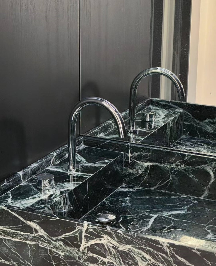 Stone wird jetzt auf kreativere Weise verwendet. Designer lieben es auch für Möbelstücke - wie aSchwarzer Marmor Couchtisch, kundenspezifische Regale oder sogar Badezimmer. Eitelkeiten. Diese Details bringen Charakter und eine moderne Kante in ein modernes Steinhaus, ohne übertrieben zu sein.
