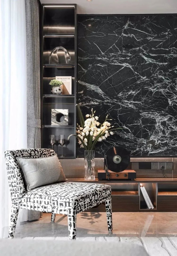 Ein Zimmer wird durch die Verwendung von schwarzem Marmor sofort dramatischer und eleganter gemacht. Es sieht auf Böden, Türrahmen oder Akzentteilen mit dunklen Hintergründen und auffälligen Venen gut aus. Verwenden Sie es einfach sparsam, weil zu viel Schwarz gelegentlich einem Raum kaltes oder schweres Gefühl verleihen kann.